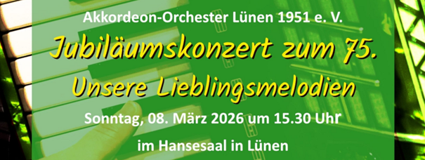2026 feiert das Akkordeon-Orchester Lünen 1951 e. V. seinen 75. Geburtstag und 2026 ist das Akkordeon Musikinstrument des Jahres. Ein Grund für uns, beide Ereignisse in einem besonderen Konzert mit unseren Lieblingsmelodien aus 75 Jahren Orchestergeschichte zu würdigen.